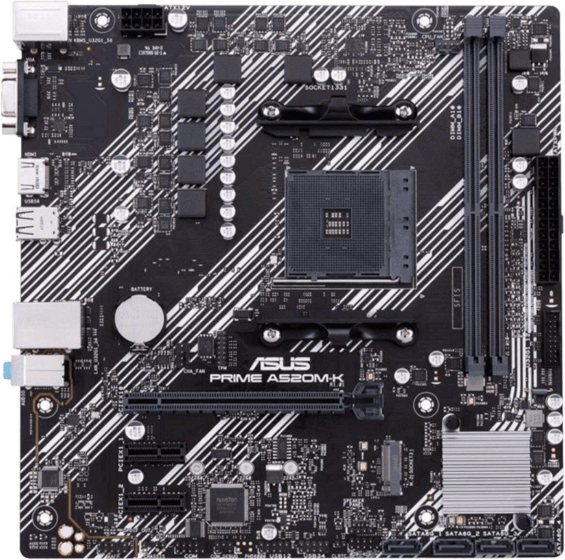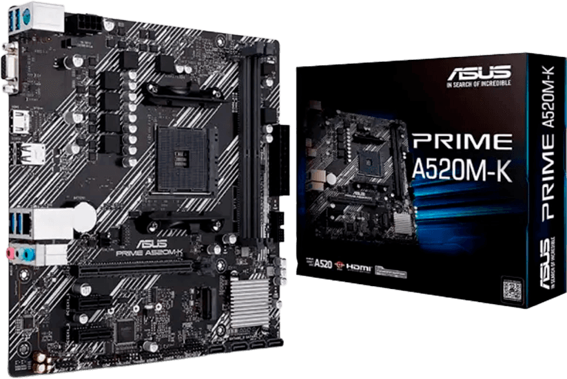 ASUS PRIME A520M-K Placa madre confiable y accesible, ideal para builds básicas y de uso diario con procesadores AMD Ryzen. Destacados: Soporte para procesadores AMD Ryzen™ 3000, 4000G y 5000 (socket AM4) Compatible con memoria DDR4 de alto rendimiento Ranura M.2 PCIe 3.0 para almacenamiento rápido Conectividad estable con LAN 1G y USB 3.2 Gen 1 Formato Micro ATX, compacto y funcional para cualquier setup