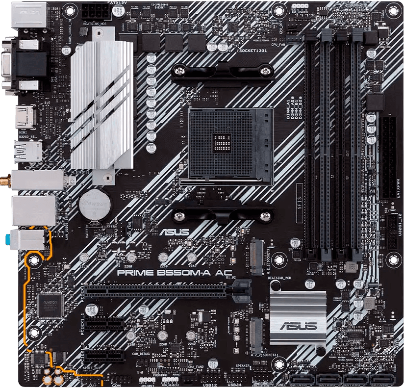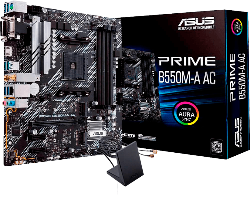 ASUS PRIME B550M-A AC Placa madre equilibrada y confiable, ideal para builds gaming y de uso diario con procesadores AMD Ryzen. Destacados: Soporte para procesadores AMD Ryzen™ 3000, 4000G y 5000 (socket AM4) Compatible con memoria DDR4 de alto rendimiento PCIe 4.0 y doble ranura M.2 para almacenamiento rápido Conectividad integrada con Wi-Fi AC y USB 3.2 Gen 2 Formato Micro ATX con buen sistema de refrigeración y estabilidad para uso continuo