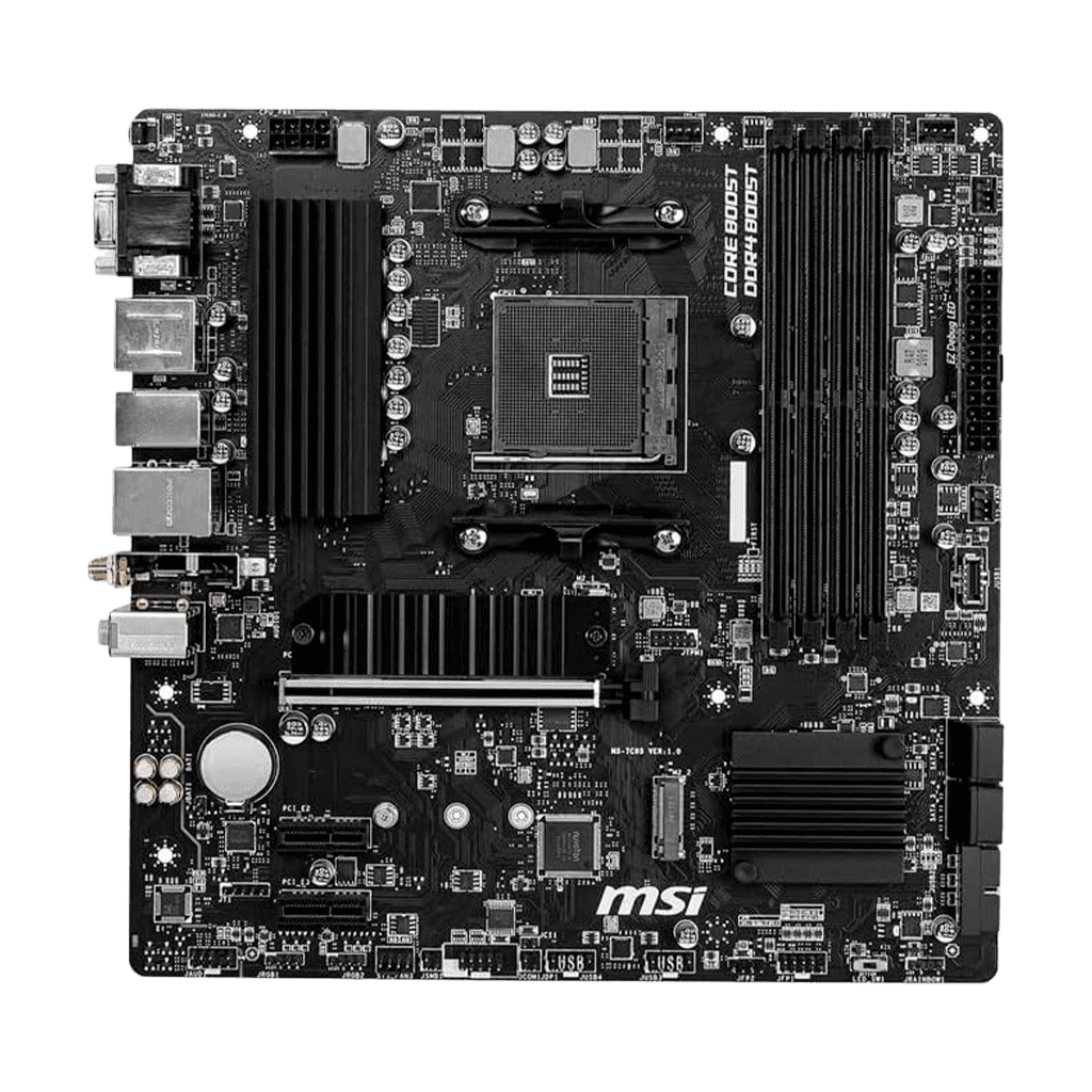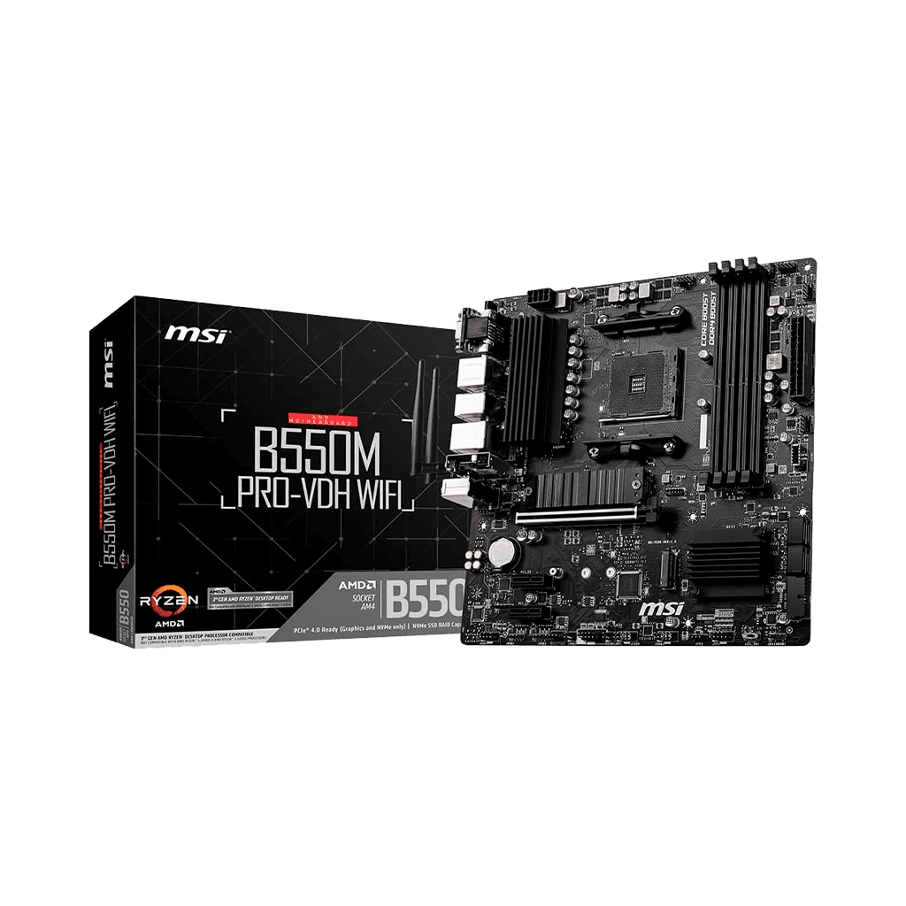 MSI B550M PRO-VDH WiFi Placa madre equilibrada y confiable, ideal para builds gaming y de uso diario con procesadores AMD Ryzen y conectividad inalámbrica integrada. Destacados: Soporte para procesadores AMD Ryzen™ serie 3000, 4000G y 5000 (socket AM4) Compatible con memoria DDR4 de alta velocidad (hasta 4400 MHz OC) PCIe 4.0 y ranura M.2 Gen4 con disipador para almacenamiento ultrarrápido Conectividad integrada con Wi-Fi AC + Bluetooth y LAN 1G Formato Micro ATX con tecnologías Core Boost y diseño optimizado para estabilidad y rendimiento