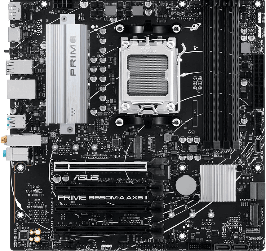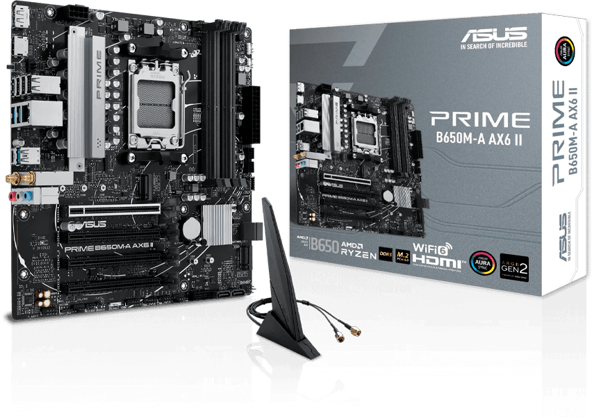 ASUS PRIME B650M-A AX6 II Placa madre moderna y equilibrada, ideal para builds de alto rendimiento con procesadores AMD Ryzen y conectividad avanzada de nueva generación. Destacados: Soporte para procesadores AMD Ryzen™ serie 7000, 8000 y 9000 (socket AM5) Compatible con memoria DDR5 de alta velocidad y optimización ASUS OptiMem II PCIe 5.0 en M.2 y múltiples ranuras M.2 para almacenamiento ultrarrápido Conectividad avanzada con Wi-Fi 6, USB 10Gbps Tipo-A y Tipo-C Formato Micro ATX con disipación eficiente y funciones como BIOS FlashBack y Aura Sync