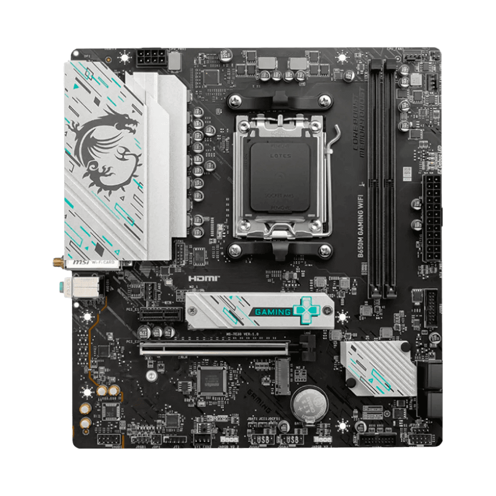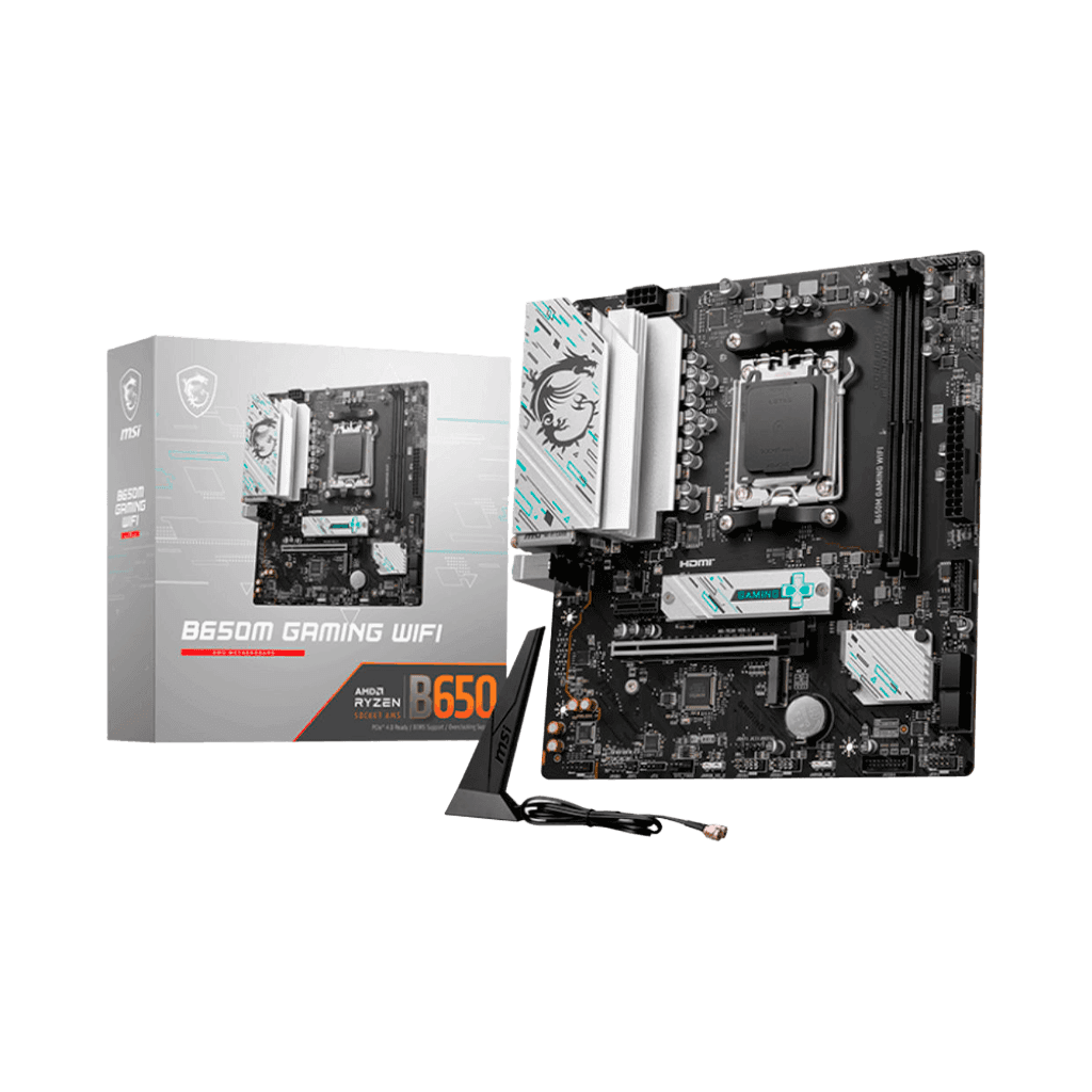 MSI B650M Gaming WiFi Placa madre moderna y equilibrada, ideal para builds gaming con procesadores AMD Ryzen de nueva generación y conectividad avanzada. Destacados: Soporte para procesadores AMD Ryzen™ serie 7000, 8000 y 9000 (socket AM5) Compatible con memoria DDR5 de alta velocidad (hasta 7800+ MHz OC) PCIe 4.0 y ranuras M.2 Gen4 para almacenamiento rápido Conectividad avanzada con Wi-Fi 6E, Bluetooth 5.3 y LAN 2.5G Formato Micro ATX con diseño Core Boost y PCB de alta calidad para mayor estabilidad