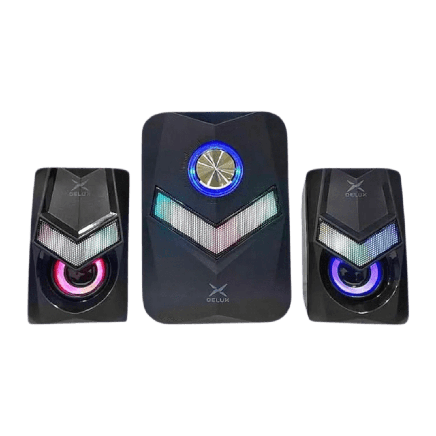 Especificaciones Técnicas: DELUX DLS-X700 Potencia Real (RMS): 11W totales (5W Subwoofer + 3W x 2 Satélites) Potencia Pico (PMPO): 15W Configuración de Canales: Sistema 2.1 (Subwoofer + 2 Satélites) Respuesta de Frecuencia: 150Hz - 20KHz Impedancia Subwoofer: 4 Ohms (5W) Impedancia Satélites: 4 Ohms (3W) Impedancia de Entrada: 10KOhms Iluminación: Retroiluminación LED RGB integrada Conectividad de Audio: Jack de 3.5 mm Alimentación: USB (5V)Dimensiones del Subwoofer: 109mm x 128mm x 157mm Tamaño de los Controladores: 3 pulgadas (Subwoofer) + 2 pulgadas x 2 (Satélites) Longitud del Cable: 1.2 metros