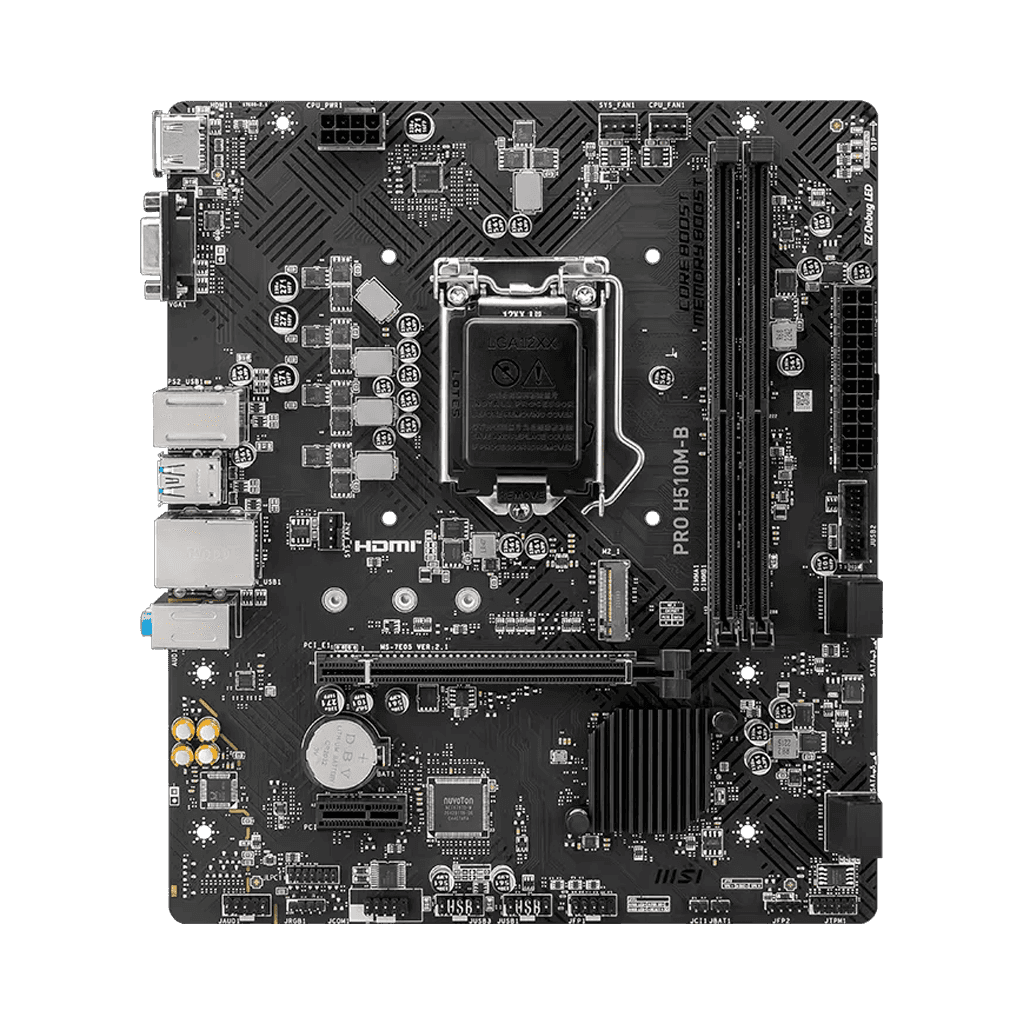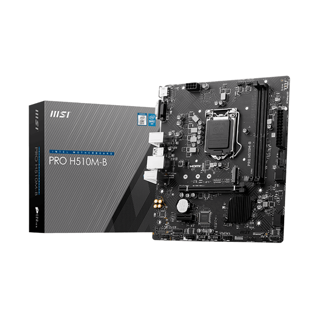 MSI H510M‑B Placa madre básica y confiable, ideal para builds económicas y de uso diario con procesadores Intel de 10ª y 11ª generación. Destacados: Soporte para procesadores Intel® Core™ 10ª y 11ª Gen (socket LGA1200) Compatible con memoria DDR4 de hasta 2933 MHz Ranura M.2 PCIe 3.0 para almacenamiento rápido LAN 1G para conexión estable Formato Micro ATX, compacto y funcional para setups básicos