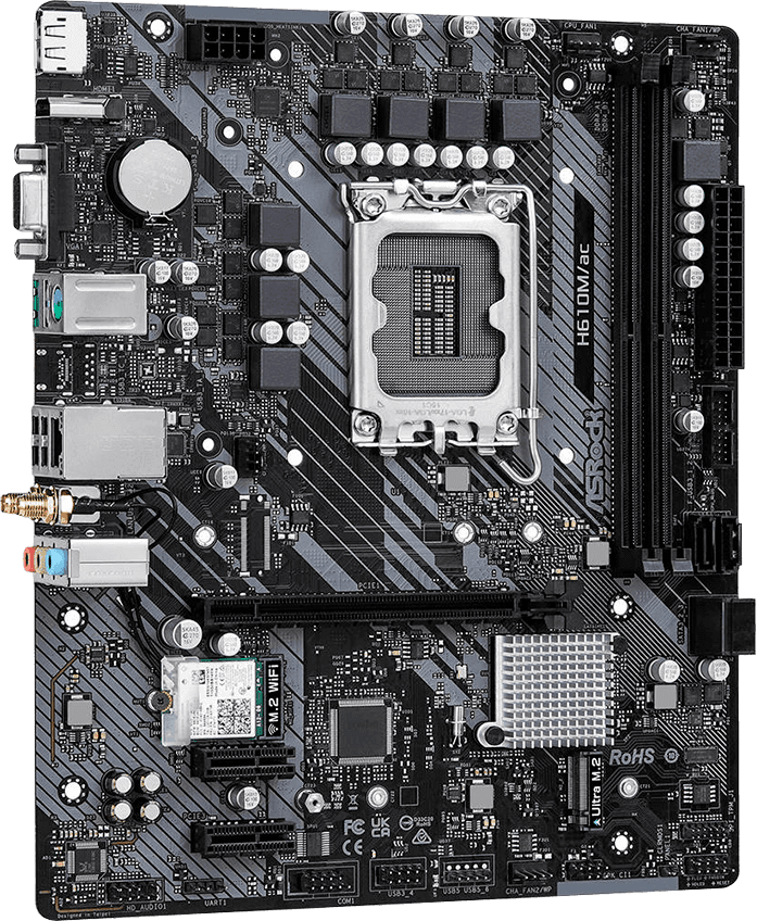 ASRock H610M/AC Placa madre básica y funcional, ideal para builds económicas con conectividad inalámbrica integrada y procesadores Intel de última generación. Destacados: Soporte para procesadores Intel® Core™ 12ª, 13ª y 14ª Gen (socket LGA1700) Compatible con memoria DDR4 hasta 3200 MHz en dual channel PCIe 4.0 para GPU y ranura M.2 PCIe 3.0 para almacenamiento rápido Conectividad integrada con Wi-Fi AC + Bluetooth y LAN 1G Formato Micro ATX, compacto y eficiente para setups básicos y versátiles