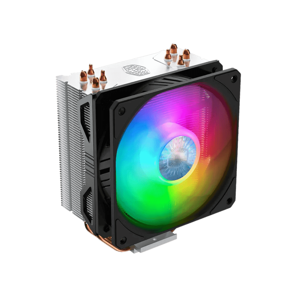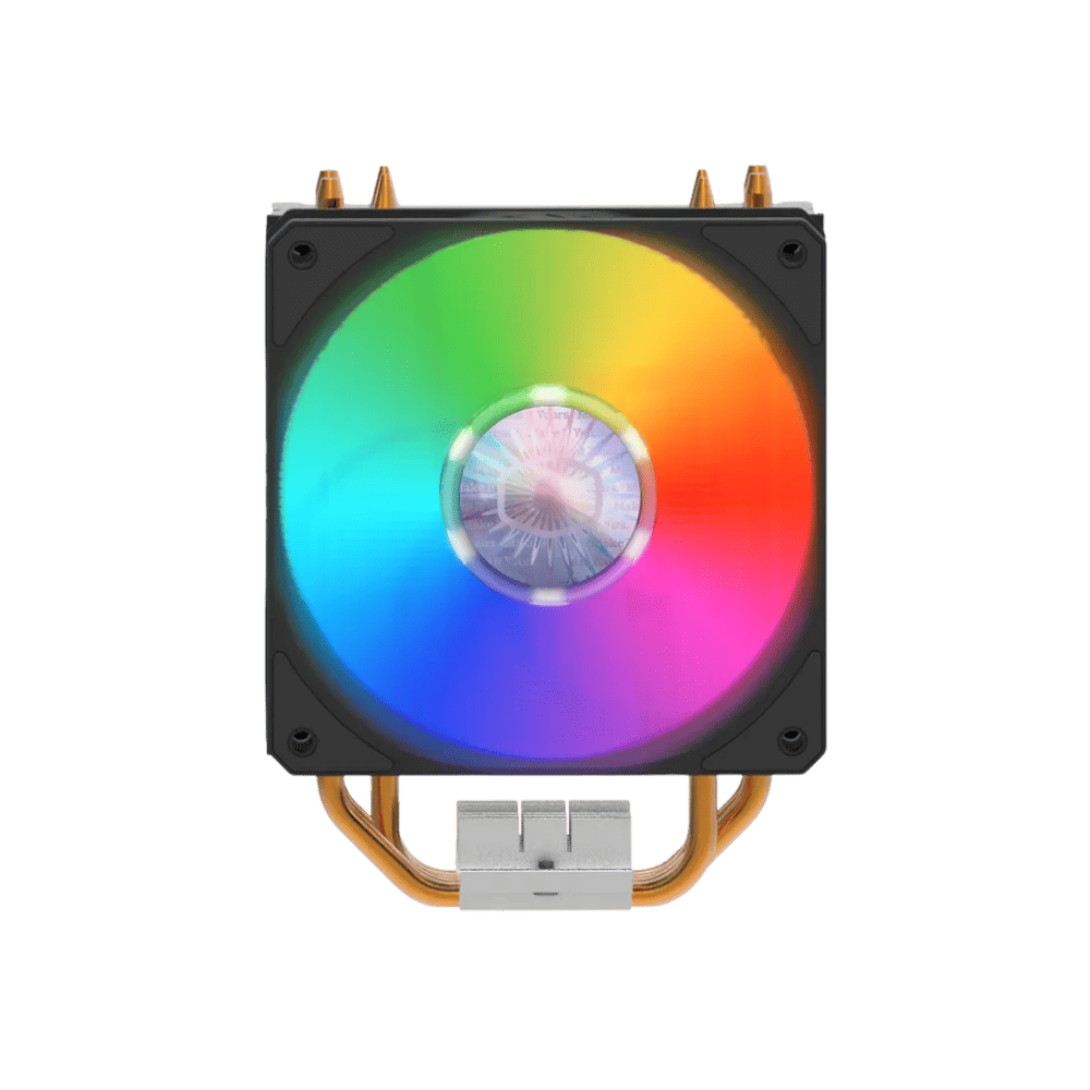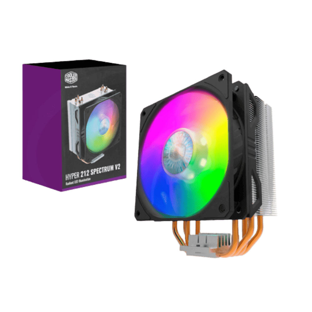 COOLER MASTER 212 SPECTRUM V2 Rendimiento: Torre de disipación con 4 heatpipes de cobre (tecnología Direct Contact) y aletas de aluminio apiladas para una disipación eficiente. Ventilación: Incluye un ventilador Spectrum de 120mm PWM con iluminación RGB (efecto de espectro de color fijo, no direccionable). Compatibilidad: Soporte para sockets modernos Intel LGA 1700 y AMD AM5 / AM4, con un diseño de soporte mejorado para una instalación más fácil.