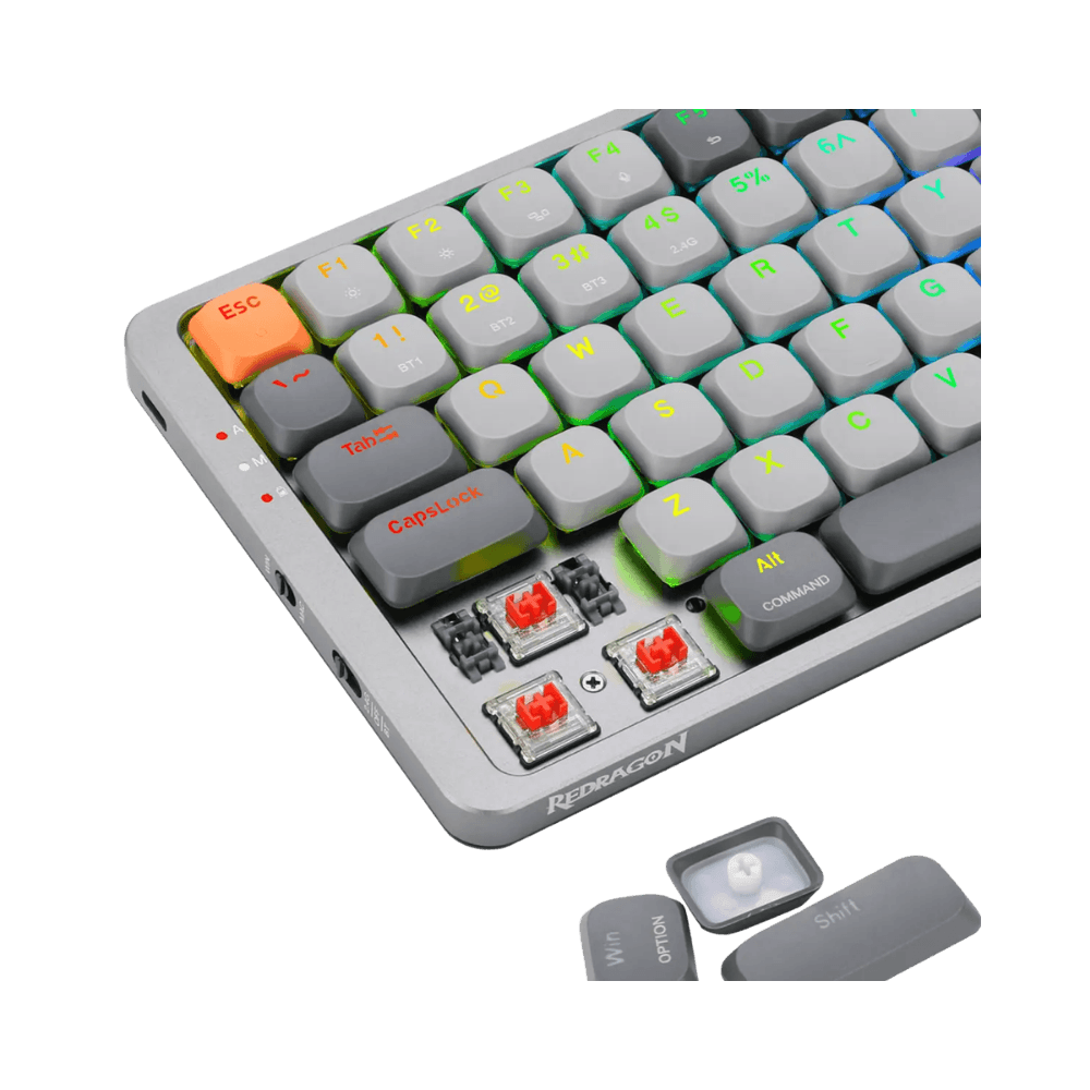 Teclado mecánico 75% low profile con conectividad triple (Bluetooth, 2.4 GHz y USB-C), iluminación RGB y switches Red lineales, ideal para gaming y trabajo. Compatible con Windows y Mac, diseño compacto de 84 teclas y batería recargable para mayor comodidad.